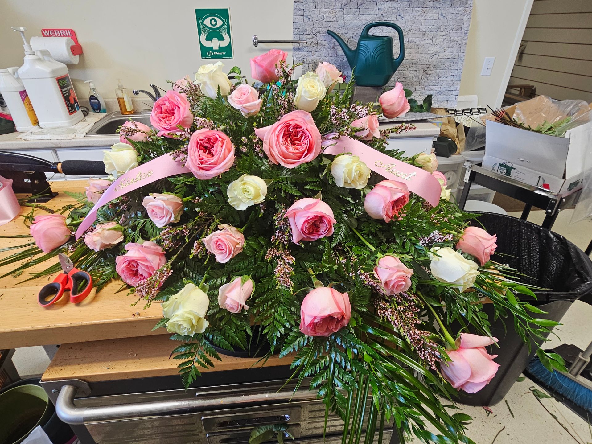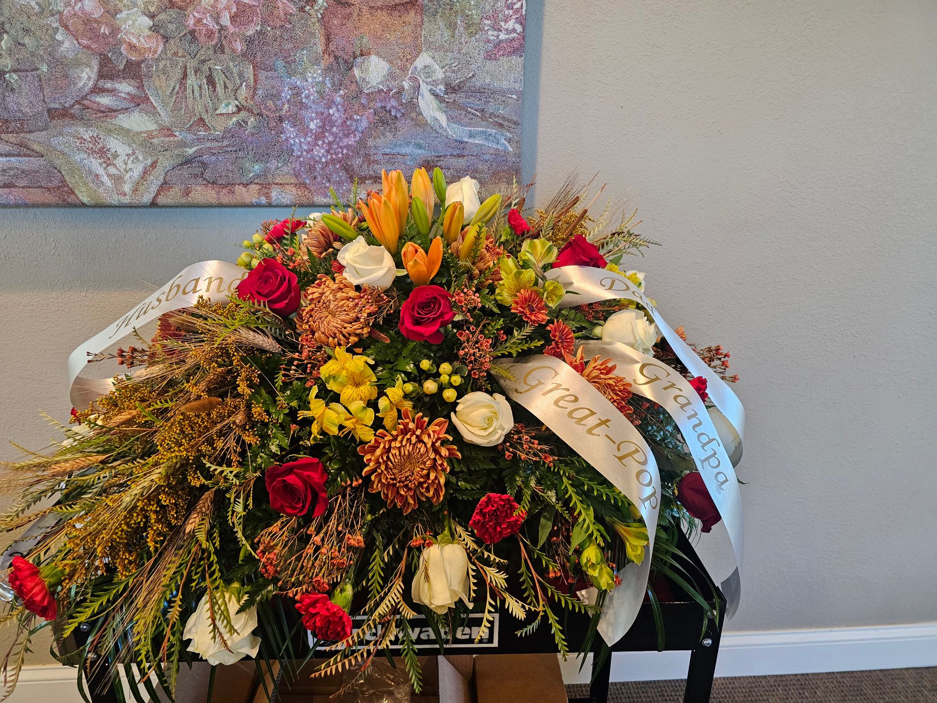 Roses, Monte Casino, Spider Mums, Wax Flower, and Glads