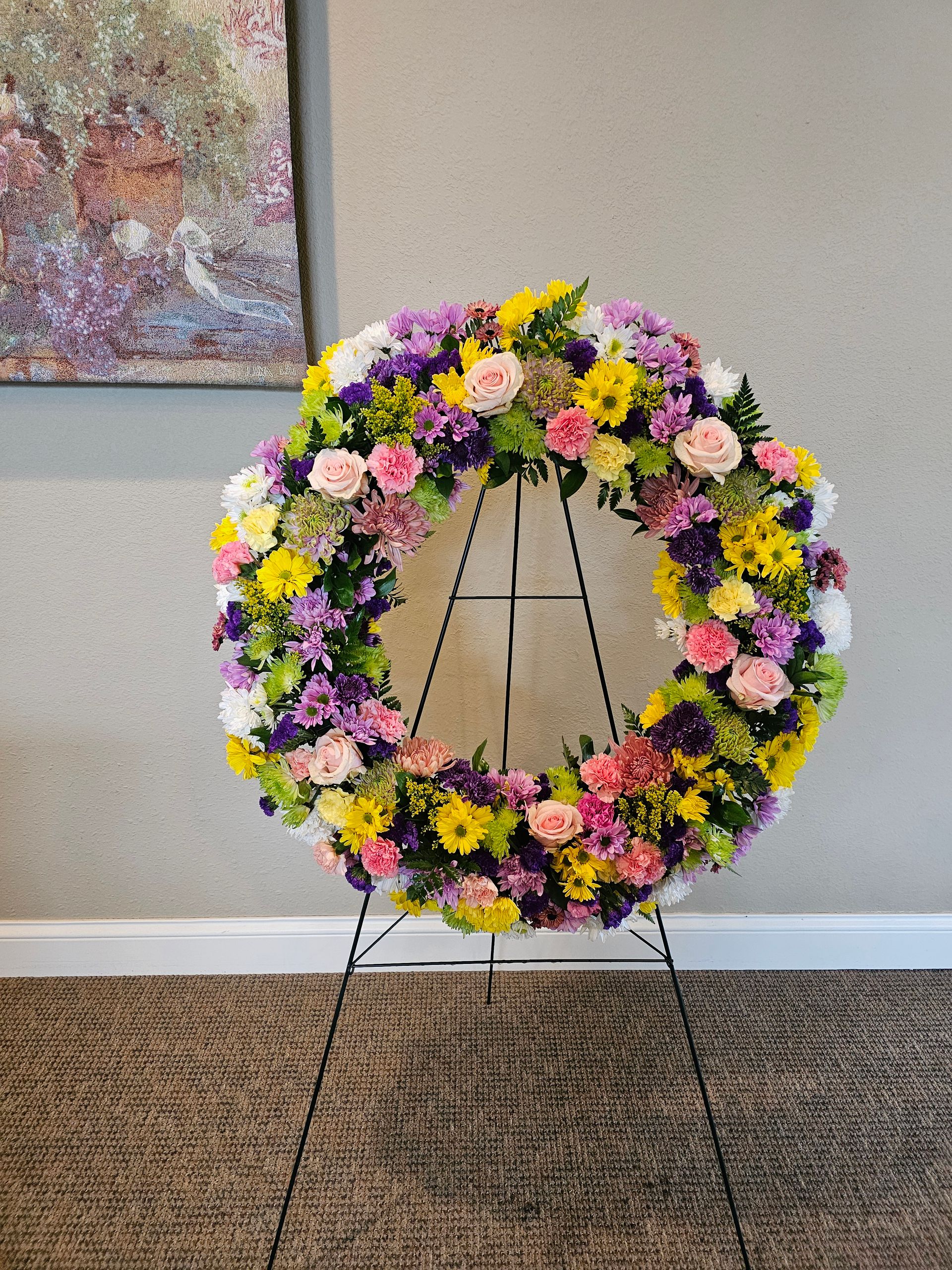 Wreath with lilies, gerbs, roses, carnations, wax flower, and eucalyptus