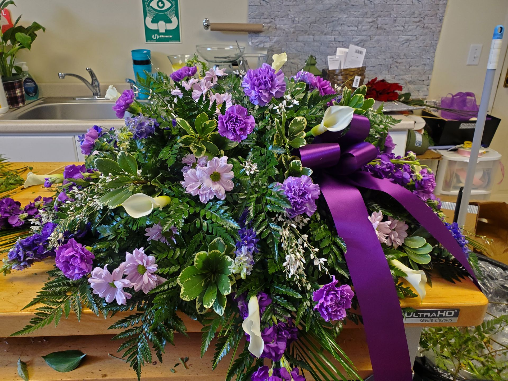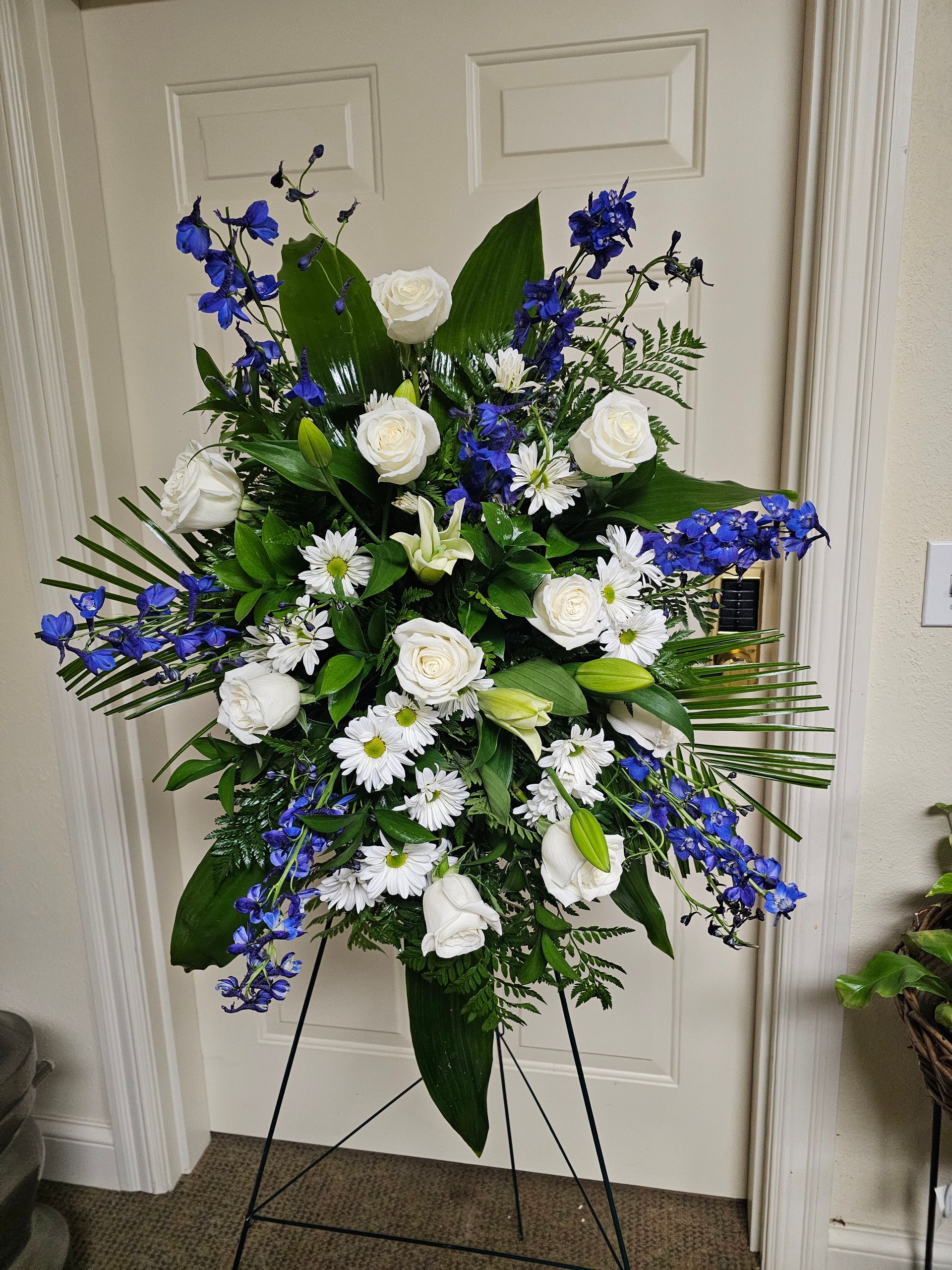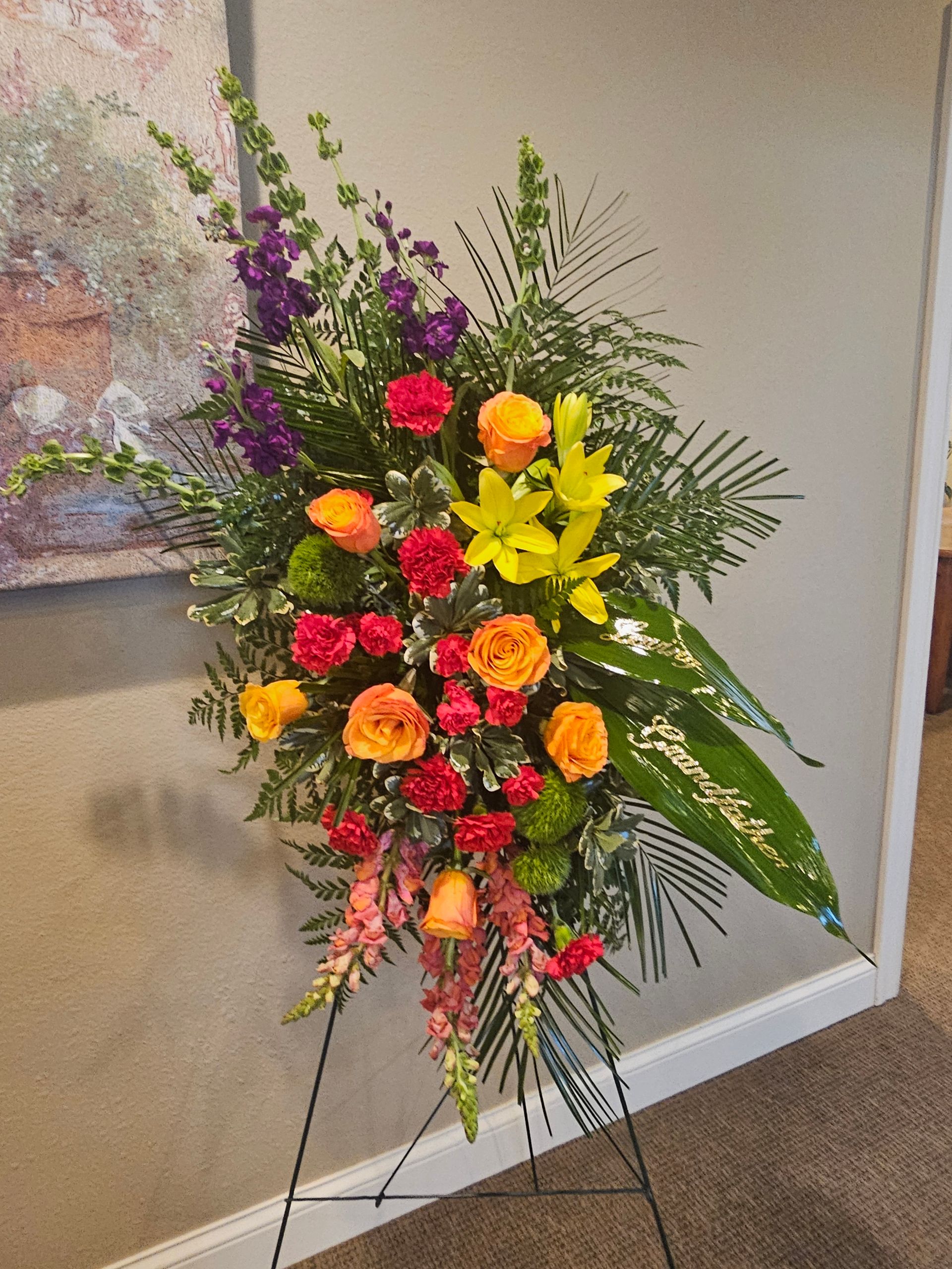 Spray with delphinium, lilies, roses, glads, daisies, and carnations